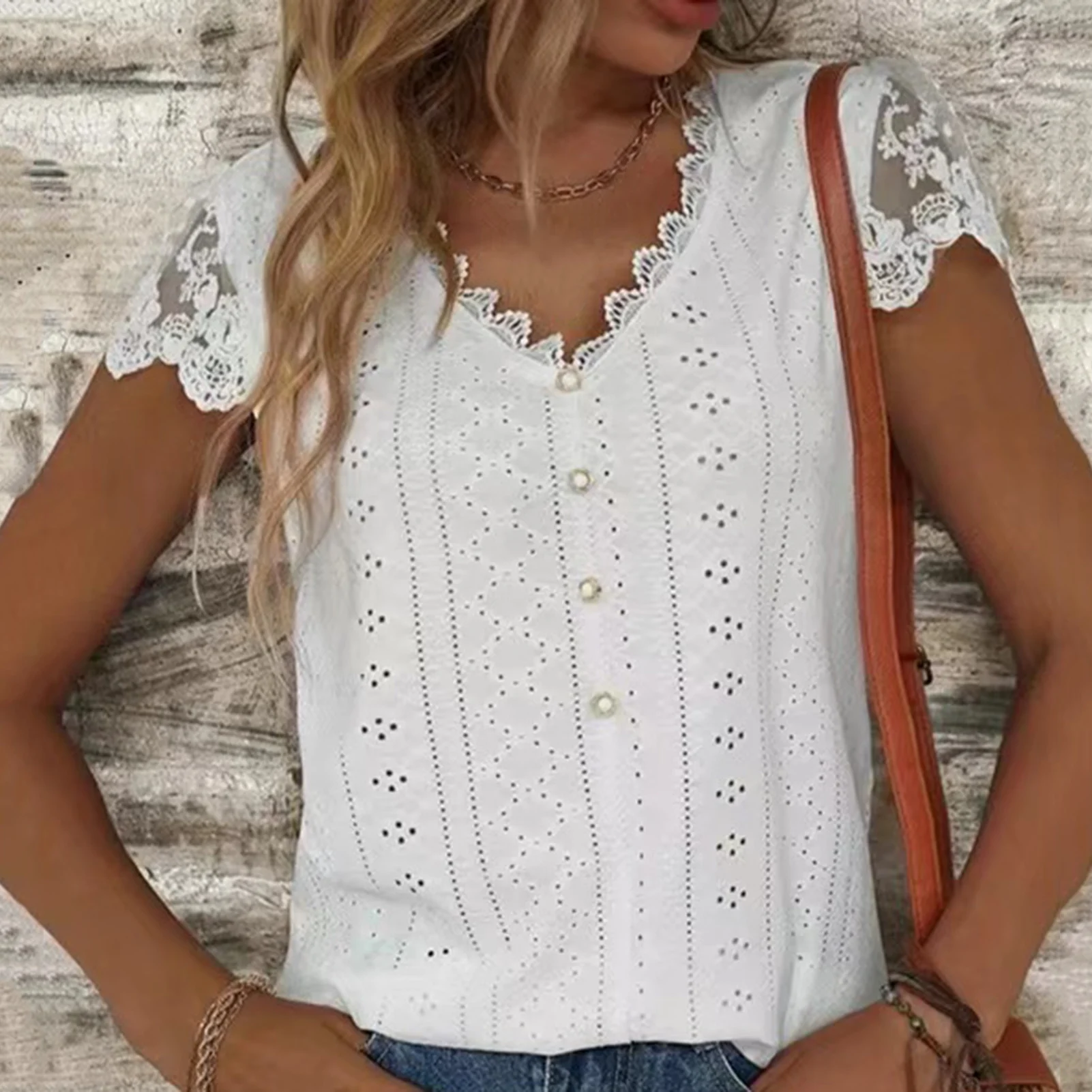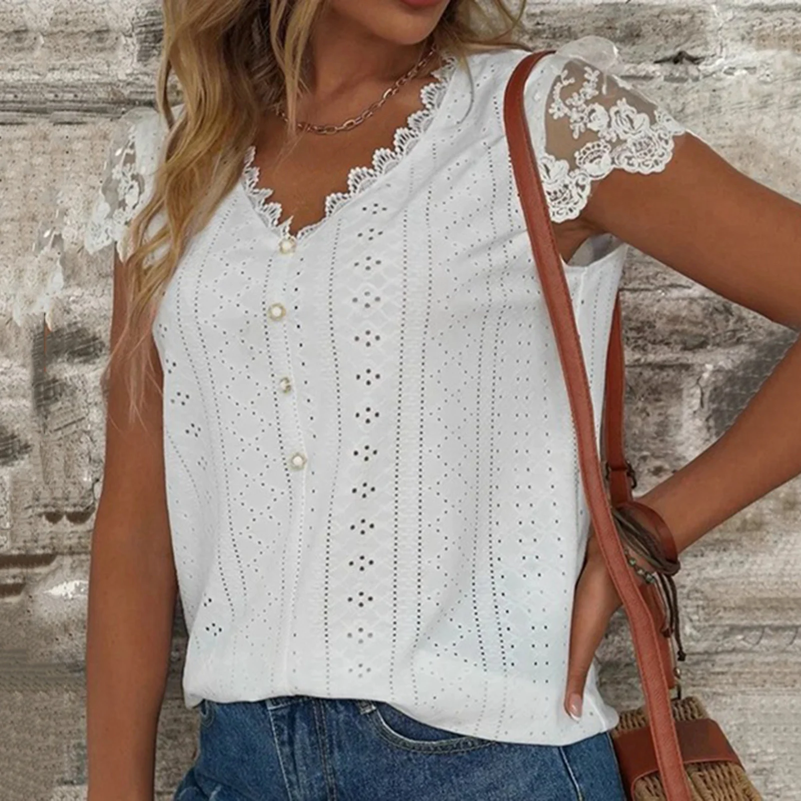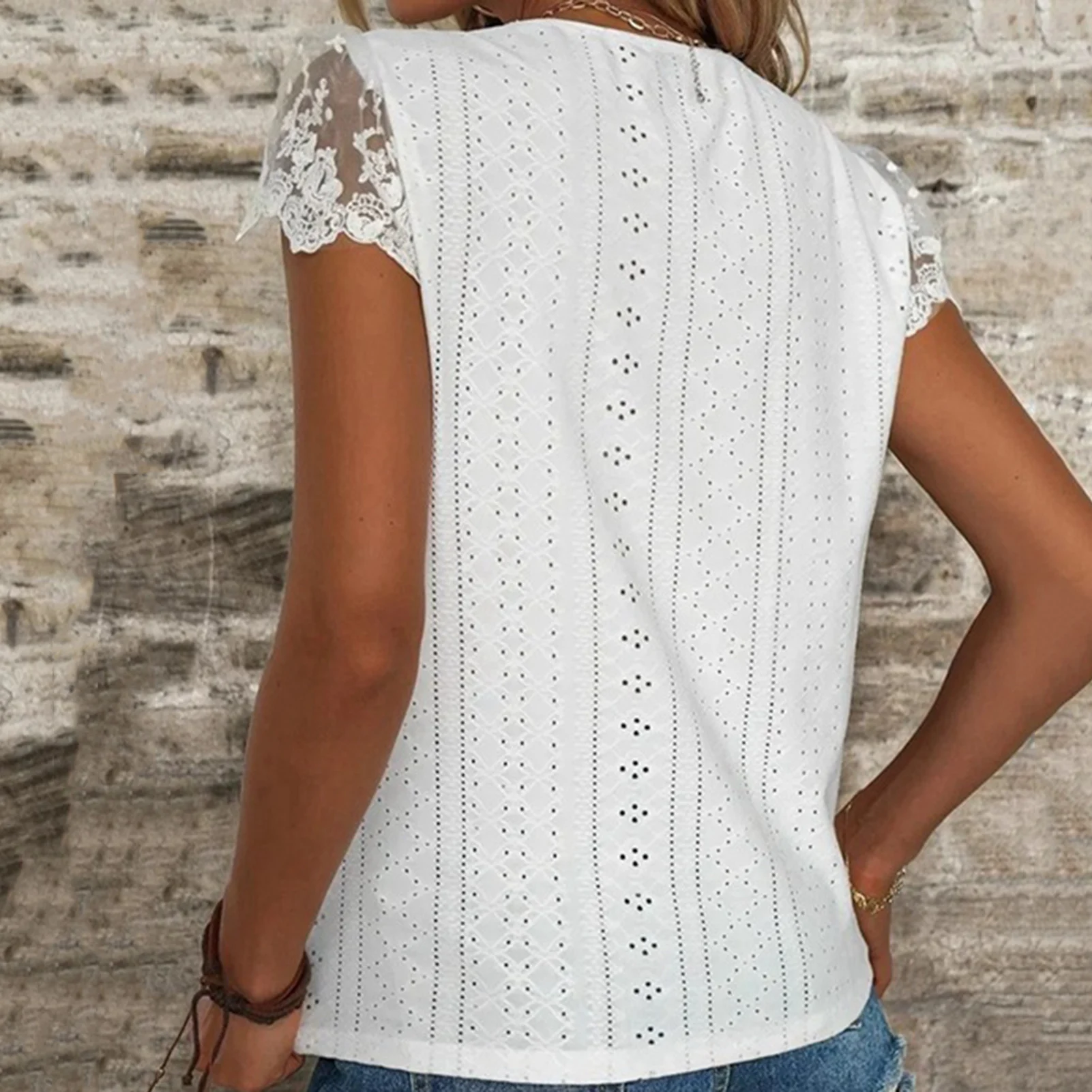 You will fully show your female charm when you pair this casual women lace spliced hollow solid color blouse with slim jeans and sneakers.